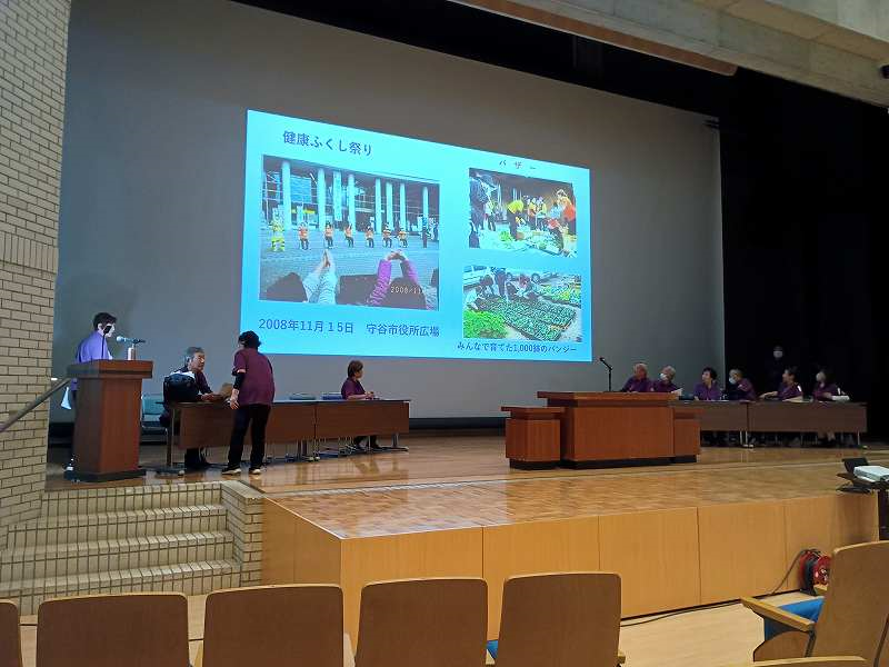 講演のテーマは「守谷市から健康寿命日本一をめざして」。守谷市の「平均自立期間」は県内1位に会場から拍手。指導士や教室参加者、行政の皆さんも驚きの表情です。さらに、2023年までは世界で健康寿命が男女ともに日本が1位。日本から世界まで見据えた活動を示唆されました。途中、全員で「片足立位」を体験。先生からたくさん動いて健康に!楽しくあっという間の1時間でした。