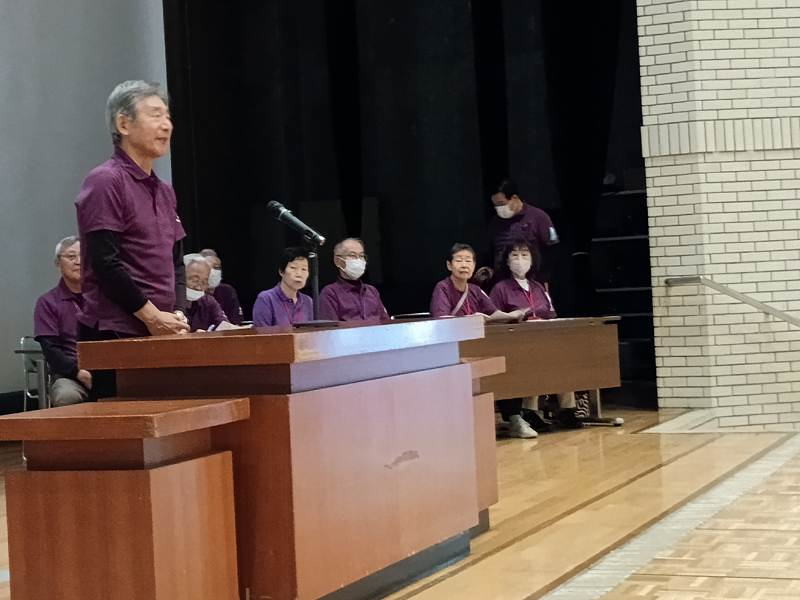 「シルバーリハビリ体操実技」は栄町、清水、みみずくなど教室、サロンの皆さんとイメージキャラクターこじゅまるが出演。リーダーは井上秀子指導士。首回し、肩の上下運動、指組み肘寄せ、両手を上に伸ばす肩の運動、肘膝タッチなど会場に合わせた組み立ての体操です。リーダーと出演の15人の息の合った動き、緩急自在の体操指導で客席から笑いと拍手が起きる楽しい20分間でした。