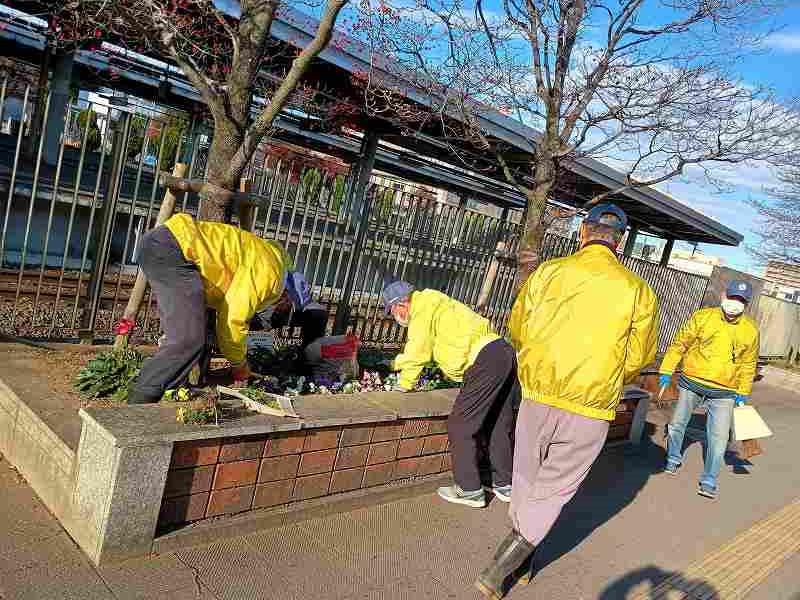 守谷駅東口の花壇を世話する仲間(2025.12.9)