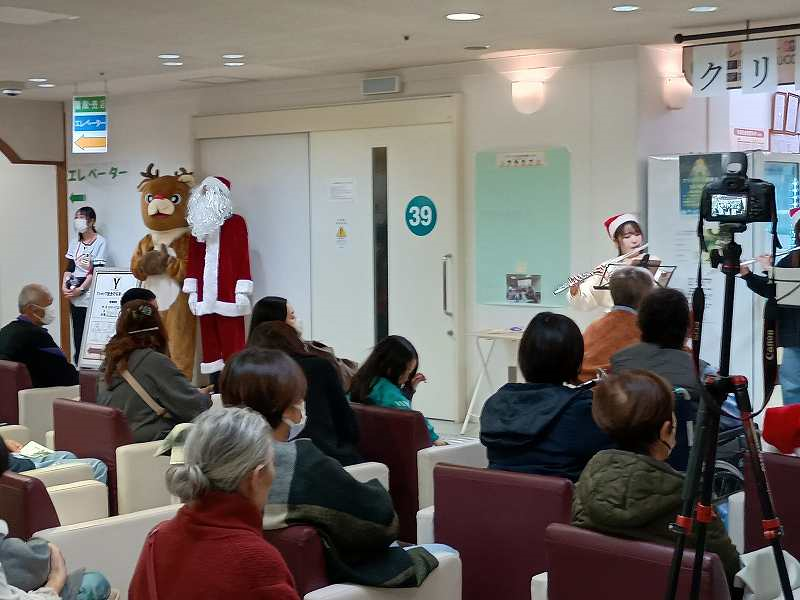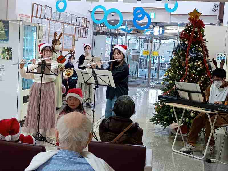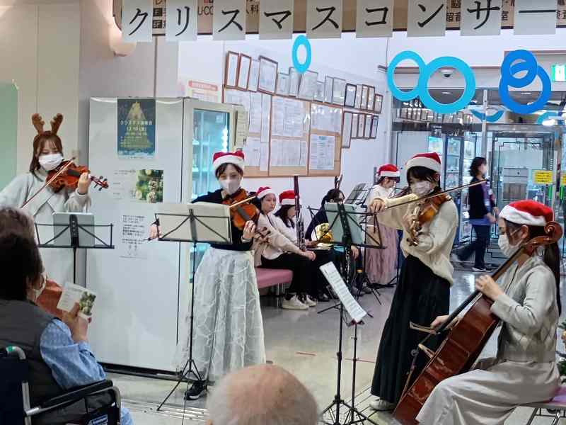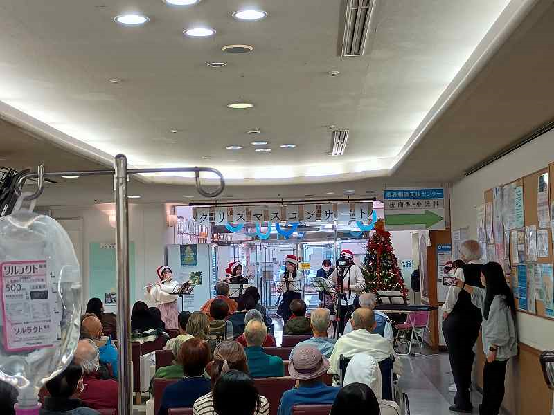16時から筑波大学医学フィルハーモニーによるコンサートが開かれました。主催は第一病院緩和ケア委員会。玄関ロビー・受付・会計など待合スペースには患者、家族、病院スタッフら150人が集合。若者たち(女性9男性1)が弦楽器、管楽器、キーボードで元気に演奏。乾杯の歌、クリスマスメドレー、ジングルベルとあっという間の30分間。心がほっこりする病院の粋な計らいでした。