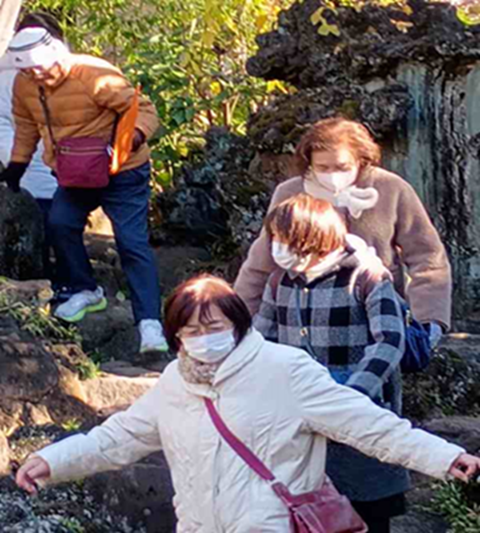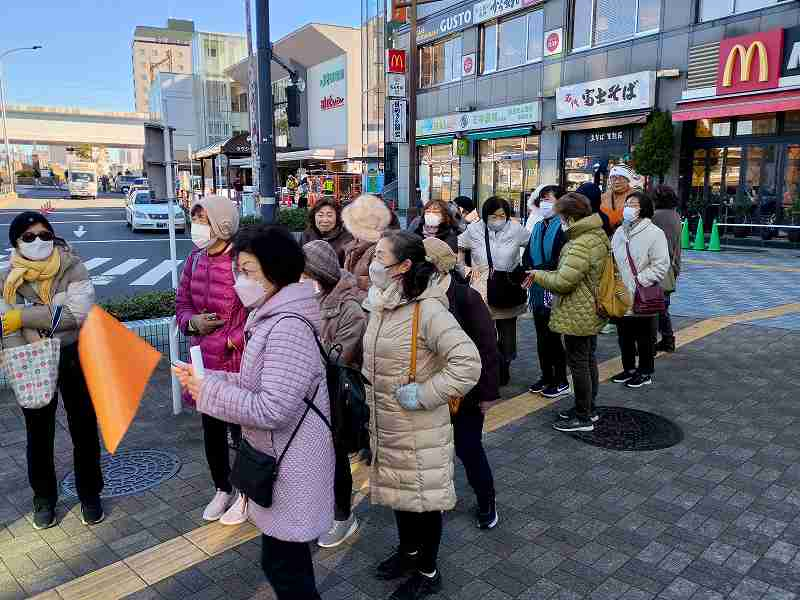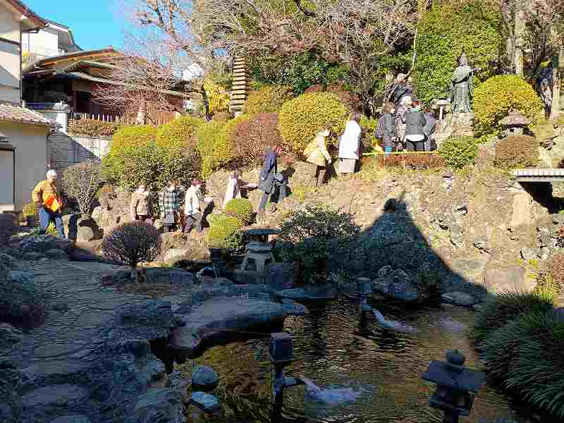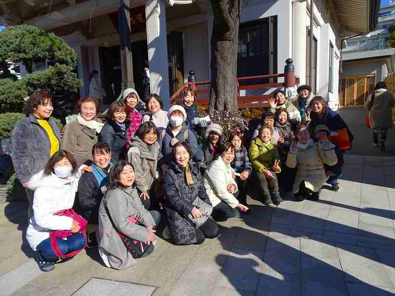 冬晴れ。北風が肌を刺す。守谷駅8:40の始発に31名(女性23男性8)が乗りこむ。オレンジ色のガイド旗を先頭に6つの班が田端駅を出発です。人混みの東覚寺を無事にお参りして集合写真撮影。山紫水明の庭園に錦鯉。心洗われて青雲寺へ。布袋様の修性院で即詠一首。「ランタナは美女軍団に囲まれて恥じらう如くこうべを垂れる」。順調に谷中銀座到着。越後屋開店前で残念の声も。